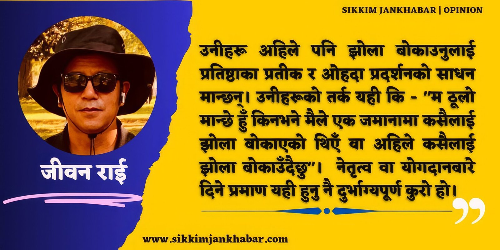 जनतालाई झोला बोकाउने नेताहरू होइन, जनताप्रतिको जिम्मेवारीको झोला बोक्ने नेताहरू हुनुपर्ने हो। त्यसका लागि सिक्किमे जनताको सोचमा आधारभूत परिवर्तन आउनुपर्छ। सरकारलाई सहुलियत दिने, नोकरी दिने, खर्च-पानी दिने, हर्जा टारिदिने दाता ठान्नु नै सिक्किमको साँचो प्रगतिमा ठूलो बाधा बनेको छ। सरकारले नोकरी होइन नोकरीको मौका दिनुपर्छ। जनतालाई सहुलियतमा भर पर्ने होइन तर आफ्नै सीप, दक्षता, क्षमता, योग्यता आदिमा भर पर्न सक्ने माहोल सृष्टि गर्नुपर्छ। जनताको खर्च र हर्जा टारिदिने होइन स्वाभिमान जोगाएर गरिखाने सम्भाव्यताले लटरम्म भएको राज्य बनाउनुपर्छ। सिक्किममा जनता भीआईपी कोलोनी र मिन्तोकगाङ धाउने होइन आफ्नो कर्मस्थल धाउने दिन आउनुपर्छ। झोले राजनीतिले ती लक्ष्य हासिल गर्न सकिन्छ भन्नु एक दिन तम्बोला पनि ओलम्पिकमा सामेल होला अनि हाम्रो राज्यले पनि स्वर्ण पदक जित्ला भन्नुसरह हो।