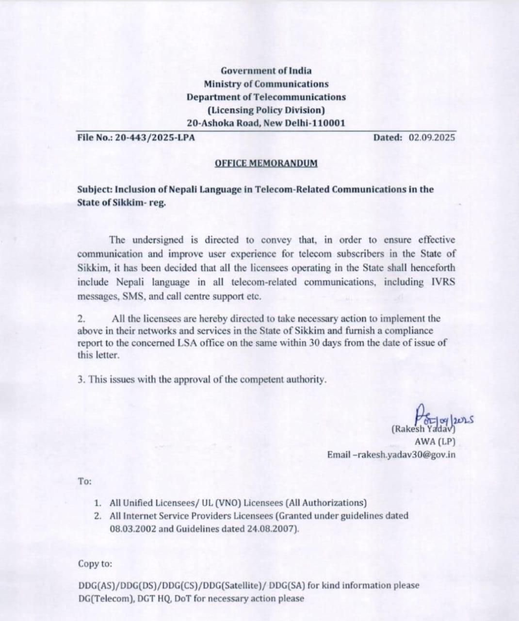 विभागले जारी गरेको आधिकारिक मेमोरेन्डम अनुसार, अब सिक्किममा सञ्चालन हुने सबै टेलिकम सेवामा इन्टरएक्टिभ भ्वाइस रेस्पोन्स सिस्टम (IVRS) सन्देश, एसएमएस तथा कल सेन्टर सेवा नेपाली भाषामा पनि उपलब्ध गराउनु पर्नेछ।